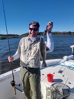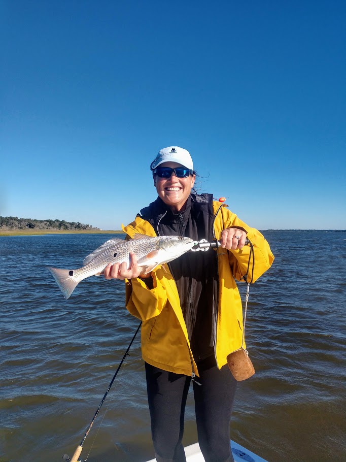 Patty had made an excellent cast to some sparse grass - she waited patiently and when she saw the float disappear, she tightened her line and set the hook! Patty worked to the net a nice fat Speckled Seatrout. She went back to the same general area with a pinpoint cast and, BOOM! Bigger Fish On! This one was ripping some drag and sure enough, as Patty brought it to the net, we saw that it was a Slot sized Redfish. Team Patty was off to a good start!