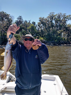 Our next stop was over in Bell River, tossing jigs and minnows up current and letting them bounce with the current, to no avail We moved up to some docks and switched to some left over shrimp I had from yesterday and this did the trick. We began to get bites and then Lee had a good hookup, fought it patiently to the boat, and landed a feisty Sheepshead. We caught a handful of those (mine tended to be the smaller ones - you gotta be good!) then we made a long run back to Fernandina.