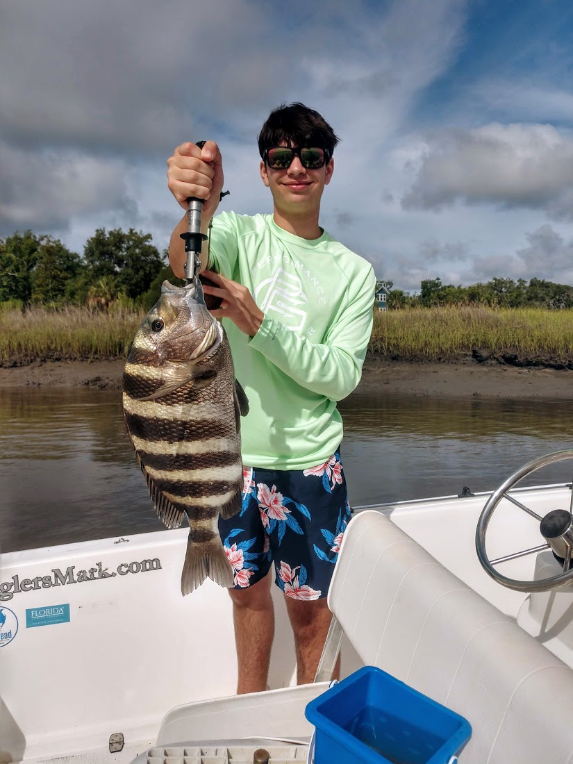 Shortly after that Ryan had the big bite. His fish stayed behind the boat but dug deep. Ryan was up to the task and fought it perectly, letting it run when it wanted to, but working it slowly in. We soon netted a nice 21.75" Sheepshead - the biggest of the year on The Anglers Mark and big enough to set the bench mark as First Place in the 2021 Bragging Rights Tournament-Sheepshead Category. (scroll down the right column for standings)