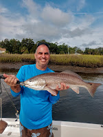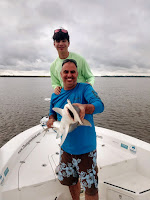 I dropped back around the corner and pulled up to a marsh runout and the duo tossed jigs and mud minnows, to no avail. We then ran up the Jolley and fished Snook Creek, at first with the float rigs, then we switched to jigs and FINALLY, BAM! Mark had a bite, and boy was it a big one! The fish headed north and the braided line almost took Ryan's head off as he was standing on the stern, But he ducked under the line and the battle was on. Mark came back to the stern and applied the pressure, fought the fish valiantly, and after a long battle, brought it to the surface to be boated, photographed, and released - a big 4 foot Bonnethead Shark.