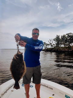 Chris had pitched a "soggy" shrimp up to the bank, let it sink, and was slowly letting it fall down the bottom when he hung up. I said, "I think I've got a stick", as he drug it back to the boat. But then it began to pull back into the current and act like a fish. I was thinking, "he's got a knot of wood or an oyster", but then the it tugged like fish. Chris worked it up off the bottom and when it came to the surface we saw it was a HUGE Doormat of a Flounder! Chris kept the pressure on, eased it towards the boat and I swooped in the the net! Boy What a Fish! We measured it to be 24.5", big enough to easily move into first place in the Angler Mark 2021 Bragging Rights Tournament-Flounder Category.(scroll down the right side of this report for standings).