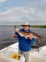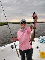 We then ran thru Horsehead and down to Pumpkin Hill and set up at a marsh point. Sandy and Doug were drifting long down one side and Scott was drifting down the other. Sure enough, after passing a jut out of grass, BAM, Scott had a hookup. He expertly worked it to the boat and landed a keeper sized Seatrout (photographed and released). He went back to the same spot, getting a good drift and BAM! Big Fish On! I thought for sure it was going to be a Redfish but as it ripped drag off we both concluded, Shark. But it was a fun catch and after a good battle, Scott brought him to the net.