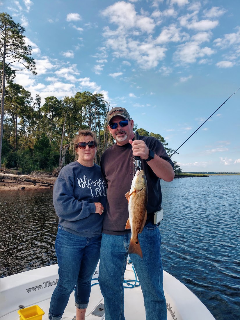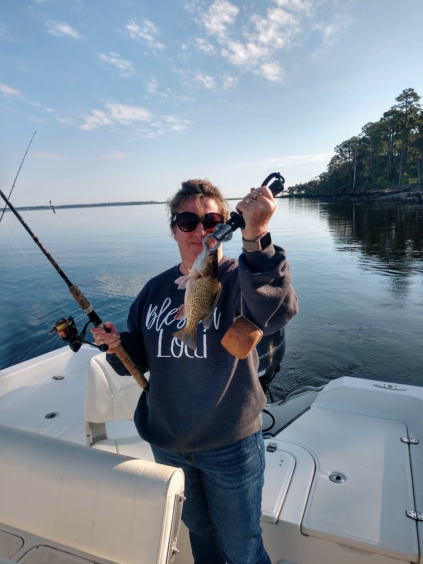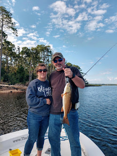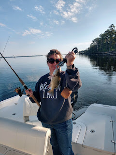 We moved down the way and fished up near a stump and here Patty honed her hookup skills by catching a handful of Mangroves, one of which was of keeper size, then Adam let his jig slide down the river bottom and out deep he had another strong bite, a hookup, and he landed a nice 17.5" keeper sized Seatrout.