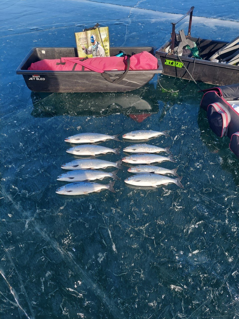 PIC # 1: This is the first limit we are aware of and nice ones at that. This angler had tried a variety of areas before scoring yesterday. Swedish Pimple and or Rainbow Kastmaster did the trick and they were all caught in a one hour period pretty deep. We promised we would not disclose his spot. Hey there’s a contest coming up we get it. pic courtesy F. Lake