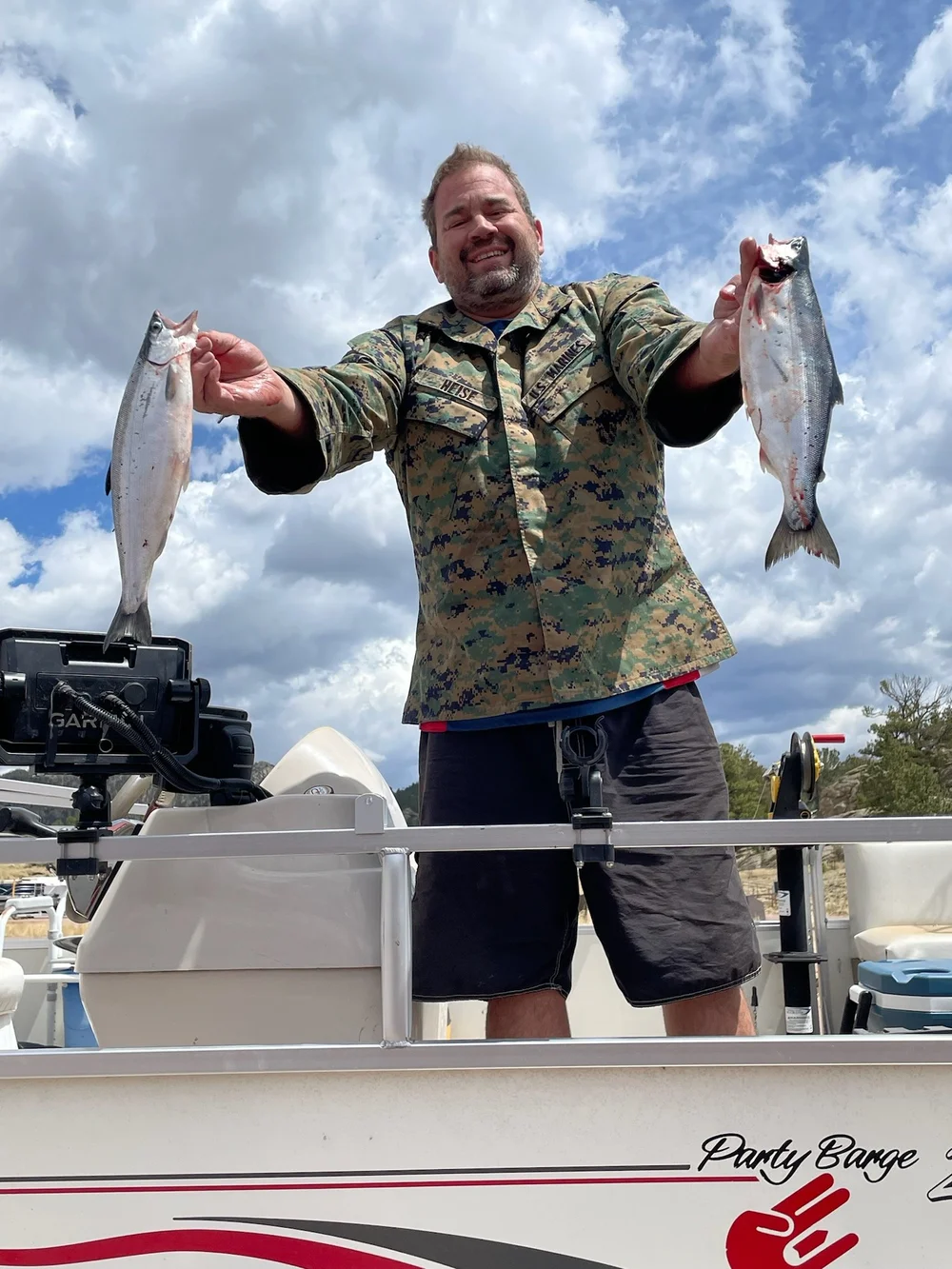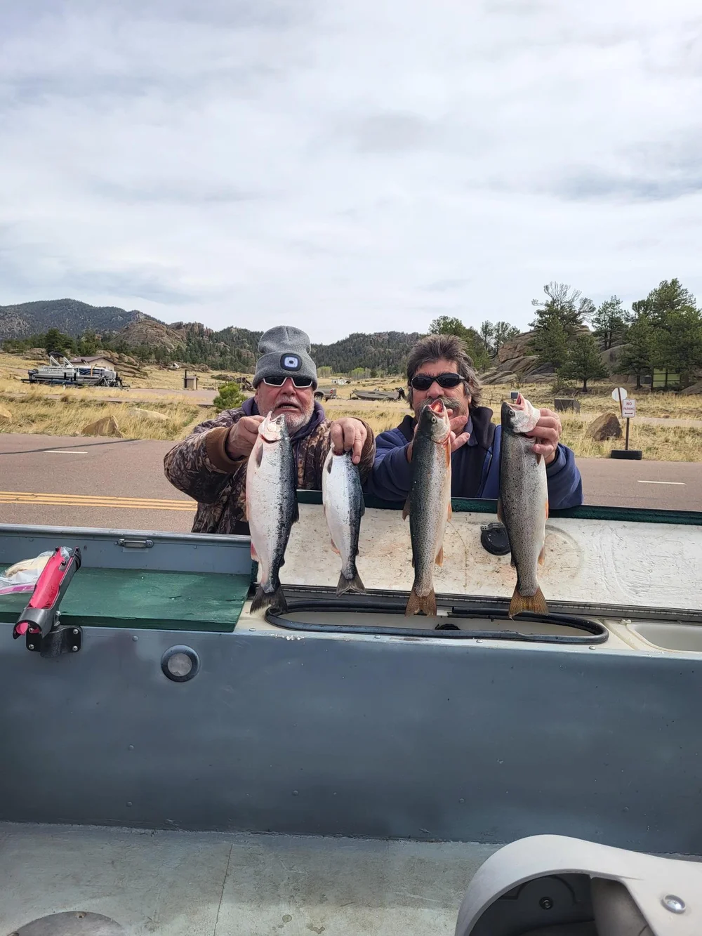 PIC # 1: 11 Mile Marina guide Carl Eslinger scores a great first time out of the season. Three nice Kokanee in a bunch of great Trout. And when you catch that many fish the action is non stop.