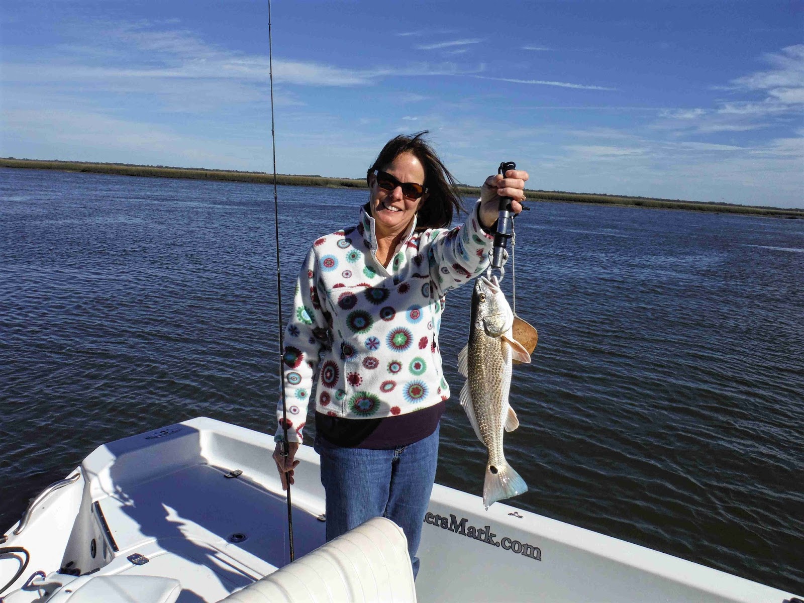 I was able to get out and do some "fun" fishing Friday with my wife, launching at the south end boat ramp on a grey and windy afternoon. We headed up the Nassau River and got in behind a land mass with plans to fish some dock pilings, and with the wind blocked, it was quite pleasant. We had a bait well full of lively live shrimp and we began to toss a jig/shrimp combo up to the pilings. It took a few casts but we were able to hookup with a Slot sized Redfish, which Carol expertly reeled in. We worked the docks thoroughly and caught another Redfish and a handful of